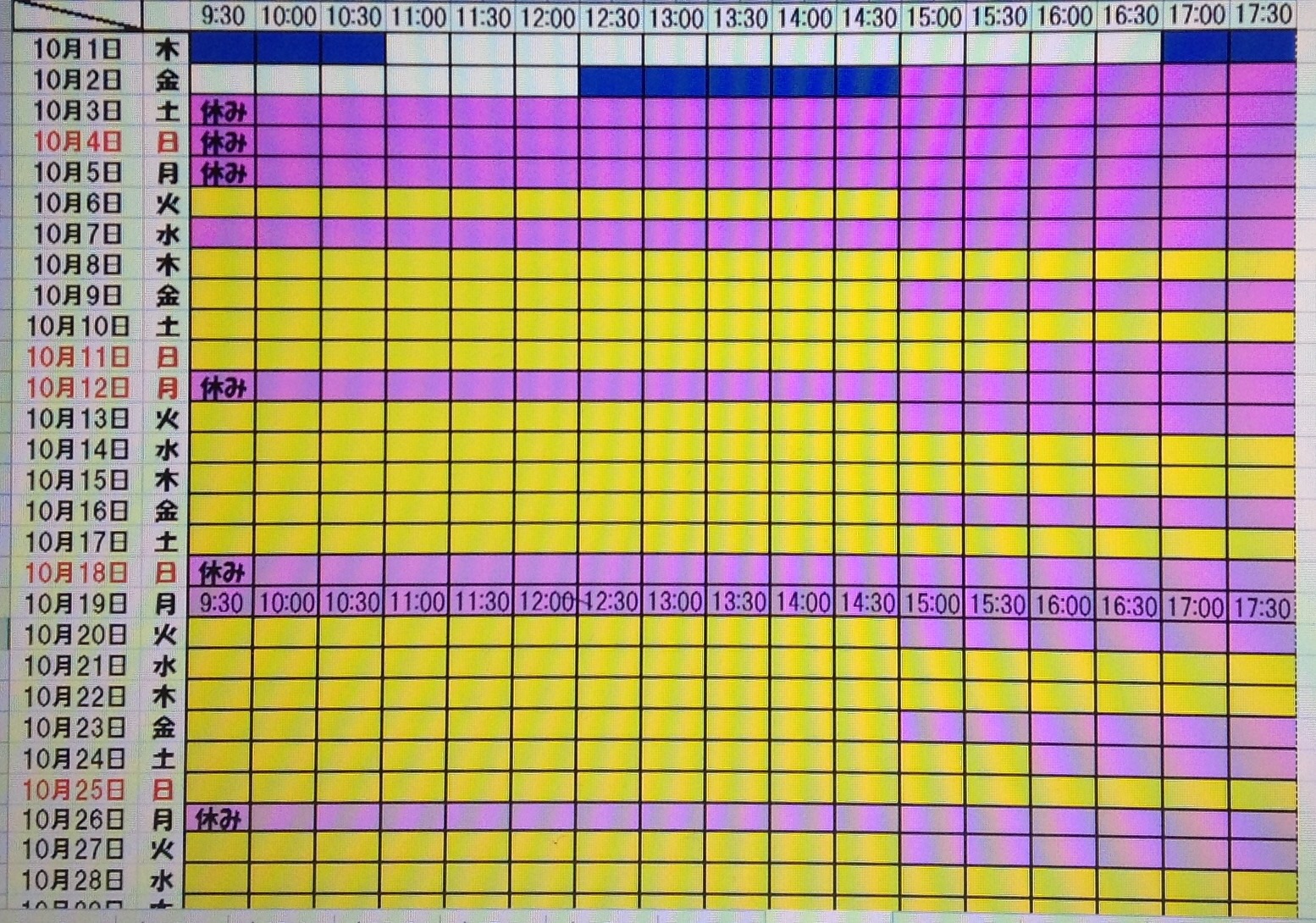黄色・・・・・・本日予約受付不可