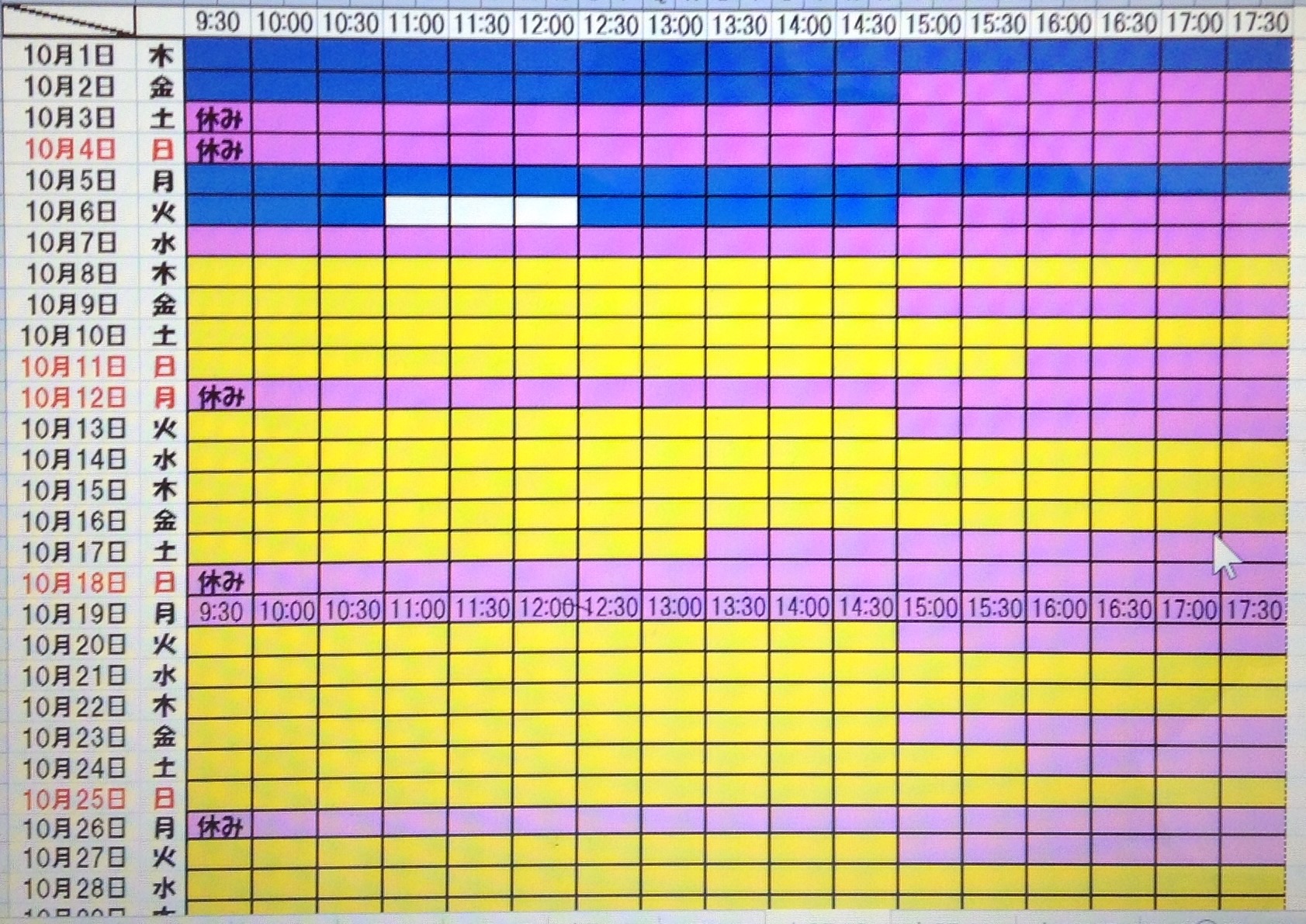 黄色・・・・・・本日予約受付不可