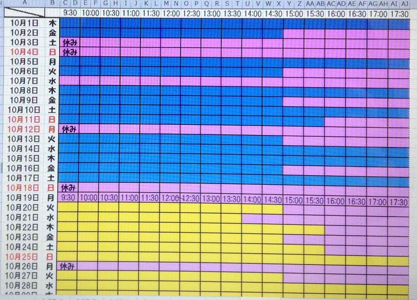 黄色・・・・・・本日予約受付不可