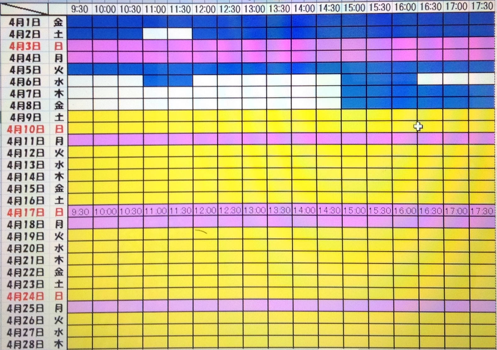 黄色・・・・・・本日予約受付不可