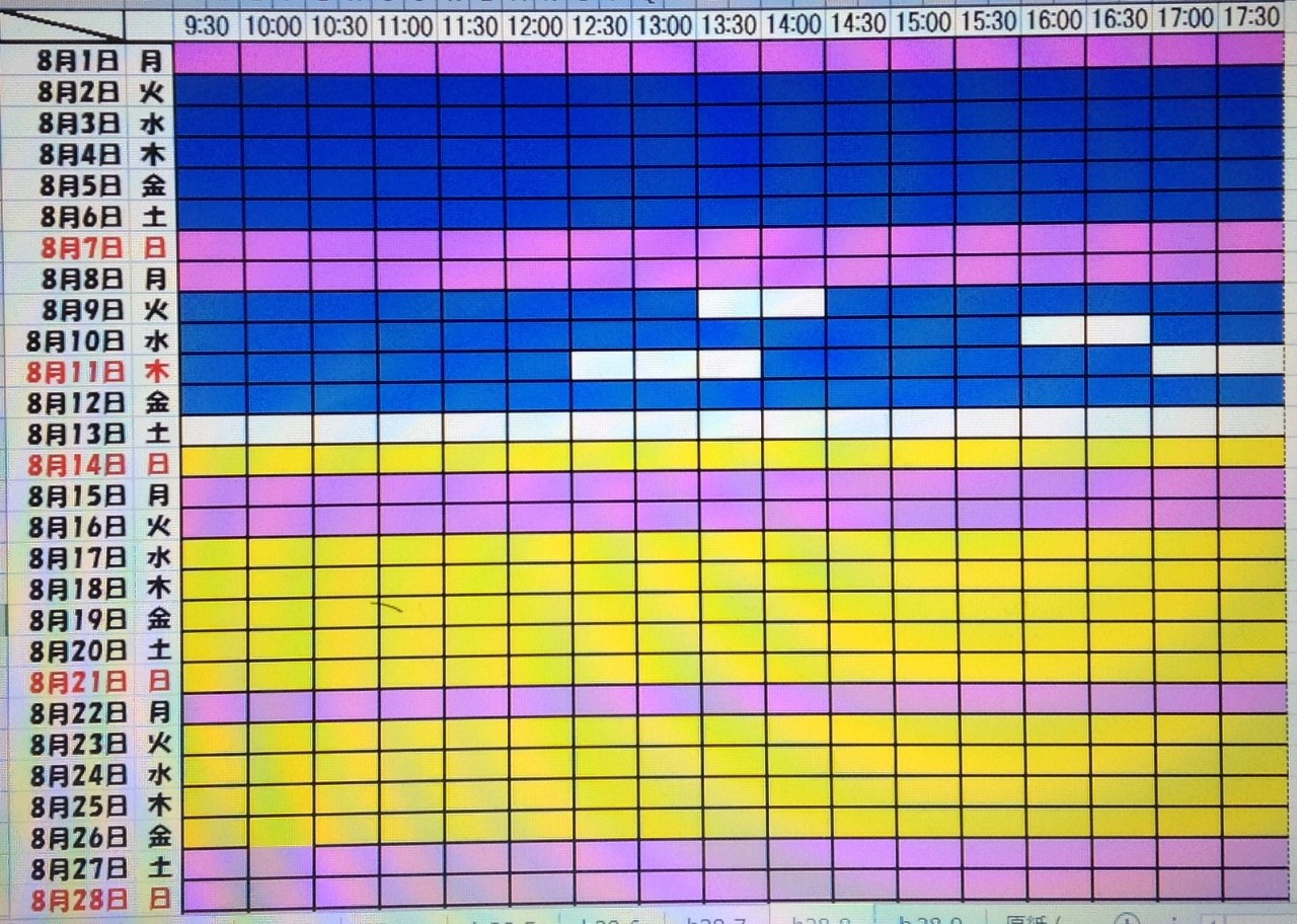 黄色・・・・・・本日予約受付不可