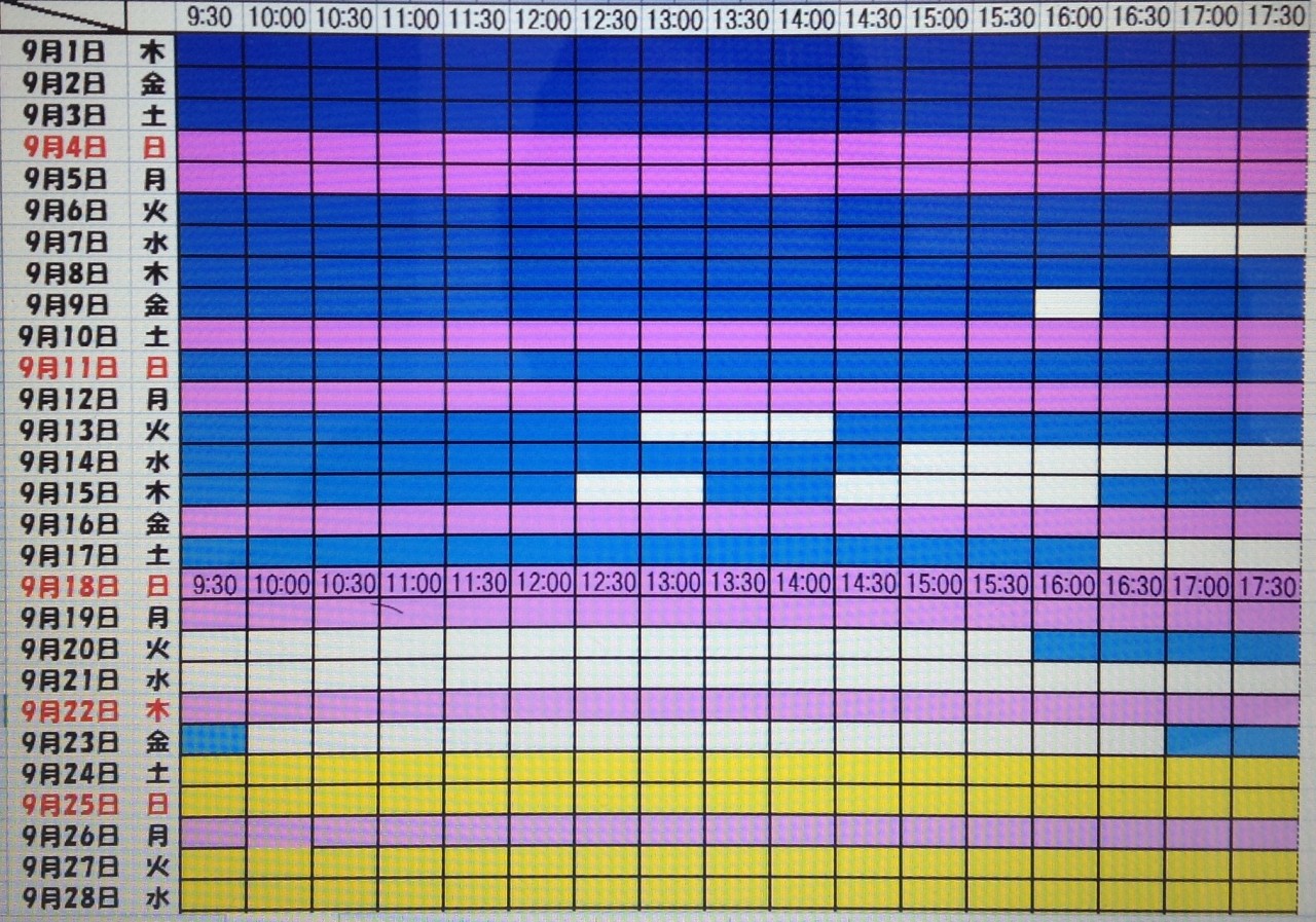 黄色・・・・・・本日予約受付不可